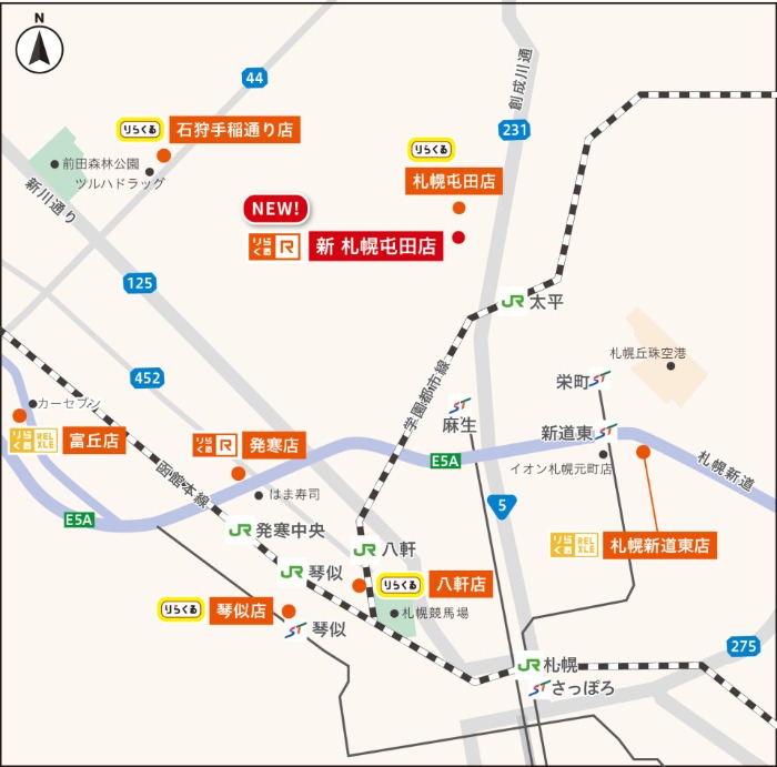 札幌市には札幌屯田店以外にも14店舗ございますので、休業期間中もぜひお近くのりらくる店舗をご利用くださいませ。