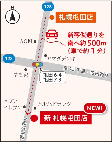 現在の店舗から、新琴似通を南へ約500m(車で約1分)